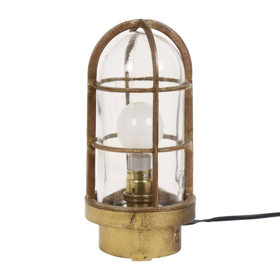 Old industrial cage lamp, ship's lamp made of glass and brass, marked IR on the glass and on the housing, which stands for Industria Rotterdam. This lamp dates from approximately the mid-20th century, Netherlands. This item has high collector's value.