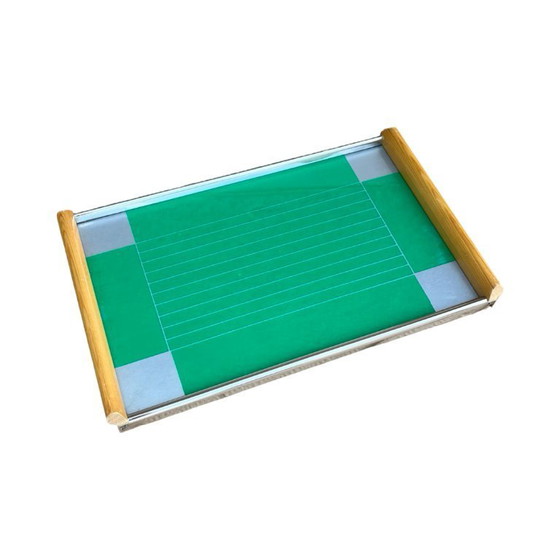 Breakfast tray manufactured by VEB Bürstenwerke Schönheide in the GDR, from the turn of the 1950s and 1960s. The frame is made of wood, the tray is made of glass, underneath there is a decal with a pattern in the style of the base. The item has been preserved in very good condition.