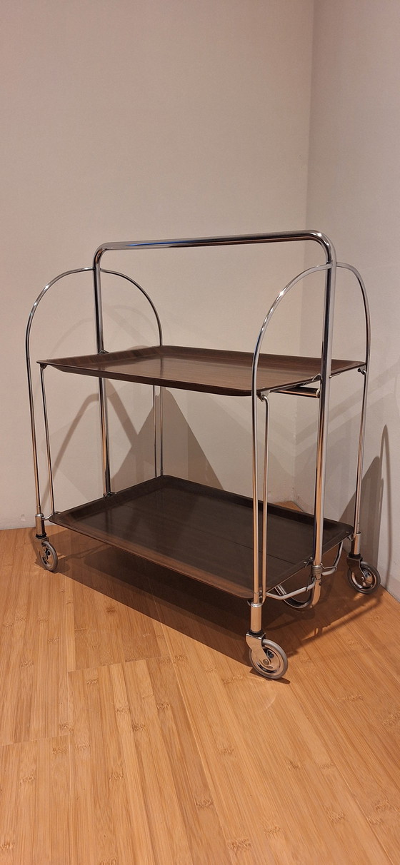 This vintage folding serving trolley "Dinett" from the German company Bremshey & Co. in Solingen, Germany, is a refined addition to any interior. With its clean lines and timeless design, this serving trolley offers not only functionality but also a touch of style. The metal frame combined with the Gerlinol (a blend of rosewood and resin with a wood grain look) tops creates a harmonious balance between modernity and classic charm.
