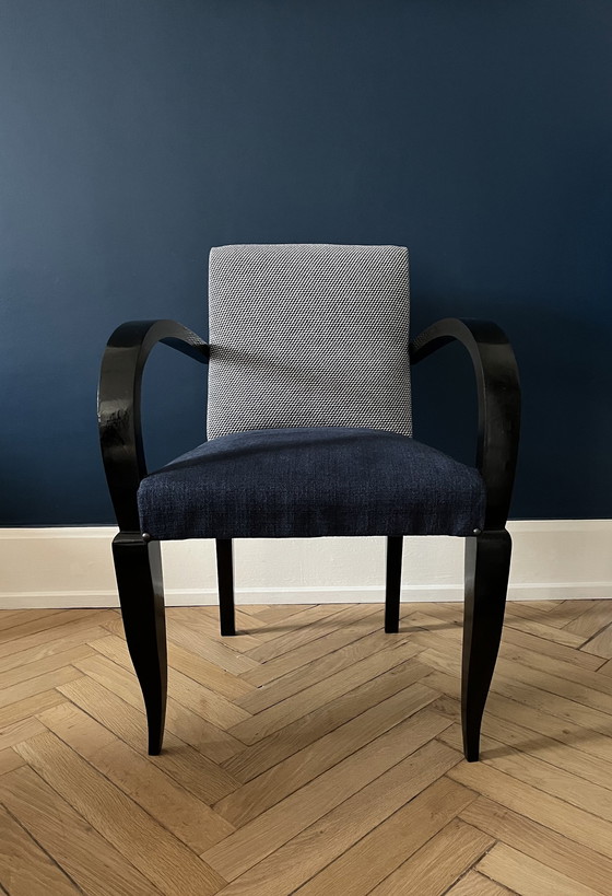 Renovated bridge Wood sanded and lacquered in high-gloss black Houndstooth and plain blue linen Nails gunmetal