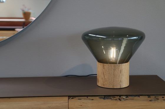 Brokis Muffins Wood 01 table lamp The Muffins collection by Brokis is a beautiful series of lamps in various sizes. Characteristic is the wooden base that gives the lamp its balance due to its weight. On top of the base is a glass shade that extends upwards. The light is dimmable via the foot switch. This showroom model has a base of European oak with a waxed finish. The shade is chosen in the color smoke grey. An exclusive, yet subtle mood lamp. Product details: * Brand: Brokis * Model: Muffins * Design: Glass: Smoke grey * Base: European oak, waxed * Dimensions: ø36 x H34.5 cm * Light source: LED E27 * Dimmable: yes, via manual switch. * Style note: Mood lamp with a modern, natural look.