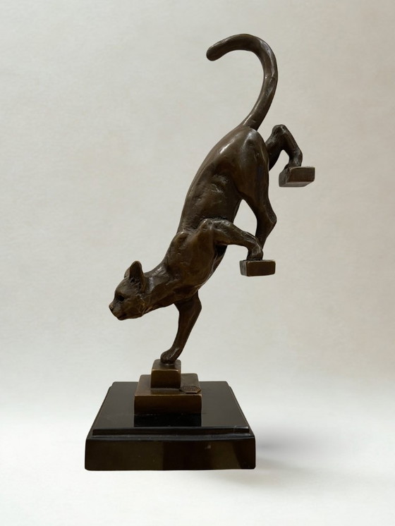 Superb patinated bronze animal sculpture of a cat descending a staircase, a work by the sculptor De Coux.