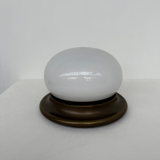 Sleek slightly convex glass white shade on bronze colored holder with slight curve. Elegant lighting on ceiling or wall. From the collection of de Zaak design and advice in Tilburg.