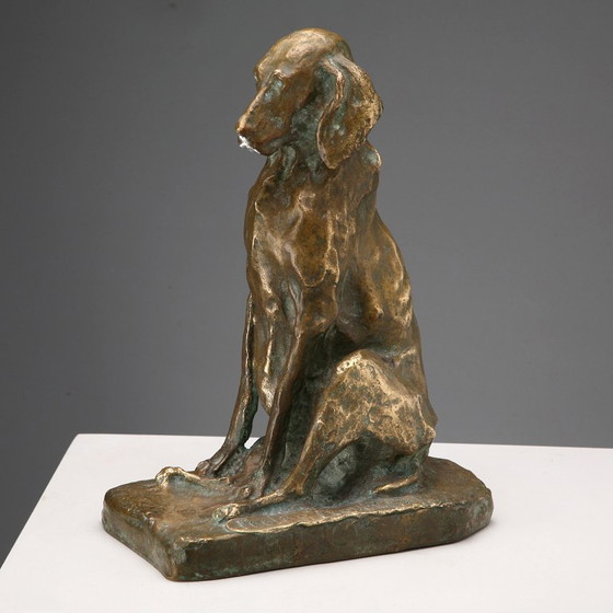 Bronze sculpture depicting a sitting dog. The artist's signature is engraved on the base.