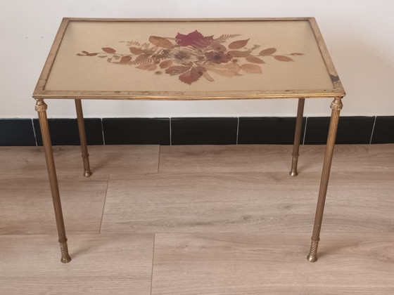 The top is made of glass with pressed flowers embedded in it. The top has some scratches.