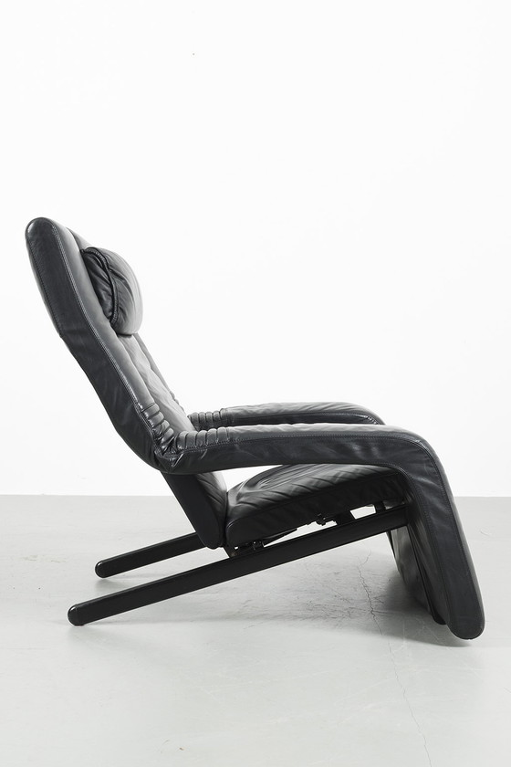 Brunati Italia armchair Armchair 'Kilkis' was designed in the 1980s by Ammannati & Vitelli for the Italian producer Brunati. The black leather chair is adjustable and in good condition. Only the armrest has a small tear in the leather.Stock 1 in stock Item number 63430 Dimensions W. 90 cm; D. 100 - 123 cm; H. 92 cm; ZH. 37 cm.Share