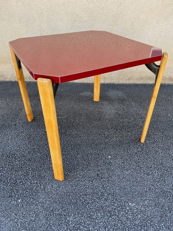 Bruno Rey table in red/burgundy Formica for Dietiker, 1970s. The table has been fully restored, the base sanded and the top re-covered in red Formica. Ideal for dining areas. The chair is sold separately.