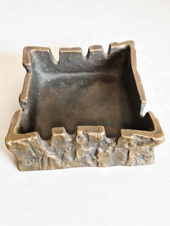 Solid bronze vide-poche / ashtray in a typical Brutalist style with strong architectural texture and cast "castle wall" relief.