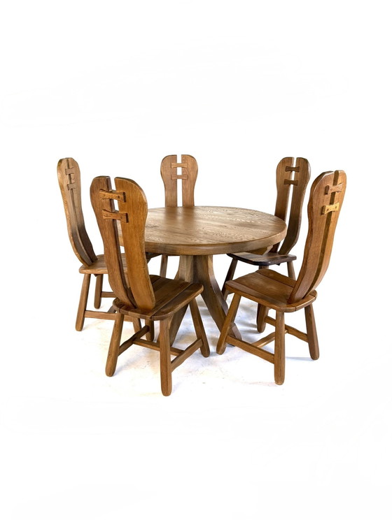 The table features a robust base with a thick, rounded top. Matching set of 5 chairs with elegant high backs and tapered legs.