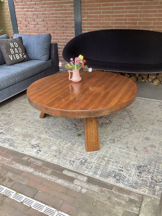 This is a stunning Brutalist oak coffee table from the 1970s. Its robust design and rich brown color make it a standout piece for any living space. Crafted from solid wood, it embodies the bold and raw aesthetic typical of the Brutalist style. The table's round shape and sturdy legs provide both functionality and a unique visual appeal. Perfect for those who appreciate vintage design with a strong character.
