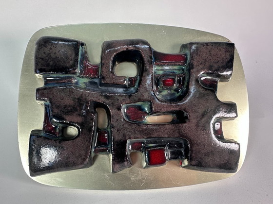 The ceramic inlay, with its thick glaze layers, relief structure, and intense colors, is strongly reminiscent of studio ceramics from the 1960s–1970s, related to designers such as: