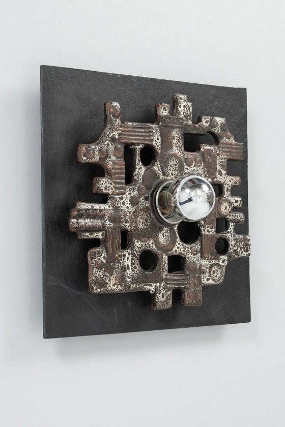 Brutalist wall lamps made of ceramic on a slate slab. Price per piece, including mirrored bulb. 3 pieces available.