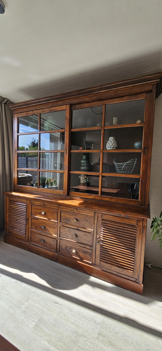Solid wood wall/buffet cabinet with an enormous amount of storage space. The deep, wide drawers and cupboard space make it user-friendly. The top section with 2 large glass sliding doors also provides a wealth of space. This two-part cabinet is extremely strong and heavy. Therefore, please take transport and manpower into account. Dimensions of the top cabinet: 145cm high x 220cm wide. (not demountable)