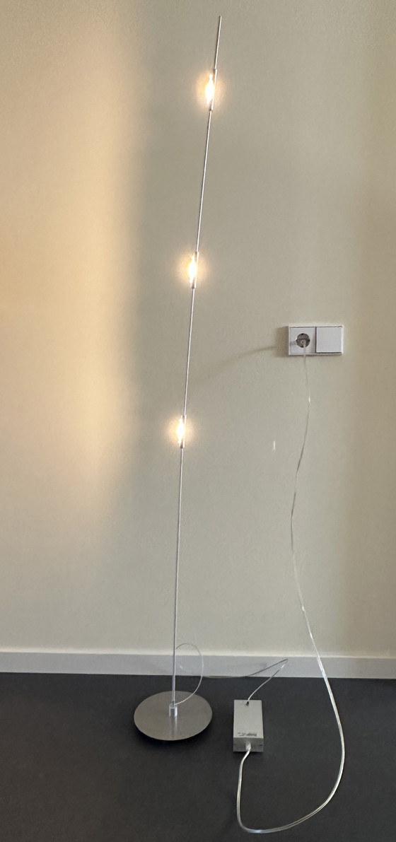 The Bulled floor lamp comes in brushed steel with halogen lights. The light is dimmable.