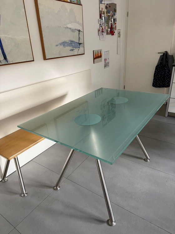 - The table impresses with its clear glass top and sturdy, fixed stainless steel legs, which ensure stability and a touch of industrial chic.