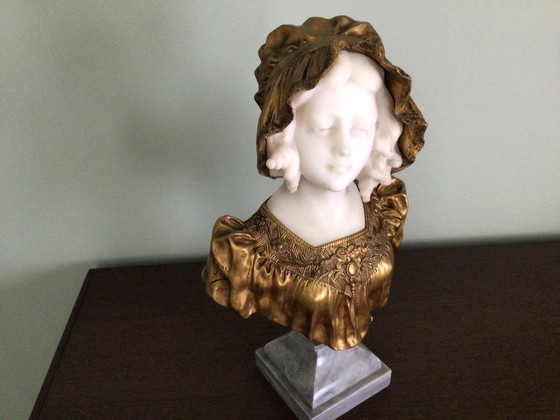 Bust or a young woman wearing a hat Carrara marble and gilt bronze signed affortunato gory 1895/1925 Italian sculptor weight 10kg height 42 width 24cm depth 12cm