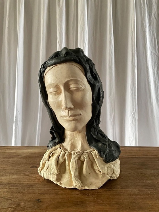 Modern-style sculpture of the Virgin Mary, likely mid-20th century. A large sculpted bust with a striking expressive presence: a serene face with closed eyes, a veil covering her hair, and a meditative, contemplative pose.
