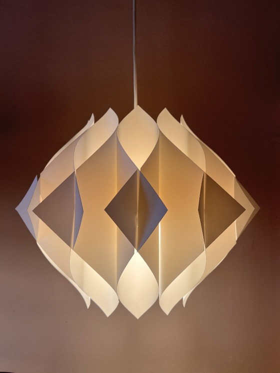 The Papillon pendant light by Lars Schiøler for Hoyrup is an iconic piece from the 1960s. Its sculptural design in white plastic evokes timeless elegance, perfect for adding a retro touch to your interior. Ideal for vintage design enthusiasts, it diffuses a soft and pleasant light, blending harmoniously into various living spaces.