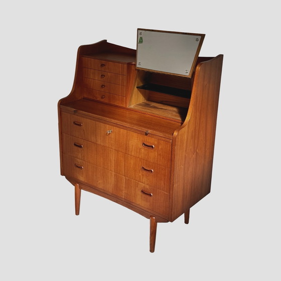 Vintage 1960’s dressoir / secretary made from teak wood, made in Denmark. In great condition and has been given a fresh coat of furniture polish. This unique piece still is marked with the original sticker on the mirror and comes including the original key.
