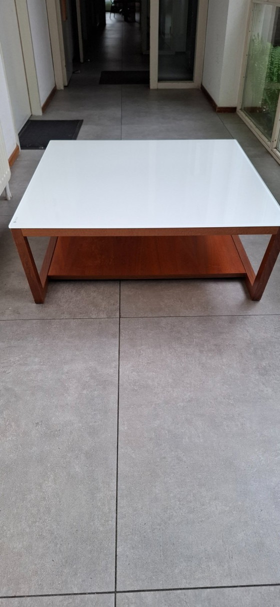 This elegant Calligaris coffee table combines modern design with functional versatility. The sleek white glass tabletop offers a sophisticated look, while the sturdy wooden base provides stability and adds a warm touch to your interior.
