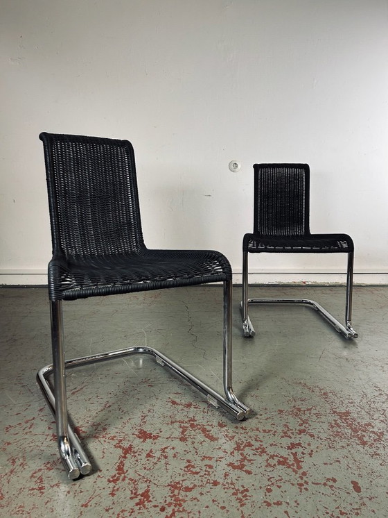 Classic cantilever chair from the 1980s. Clean lines, a chrome-plated tubular steel frame, and a black plastic wicker seat. The chair combines functionality with understated style and fits effortlessly into both modern and classic spaces.