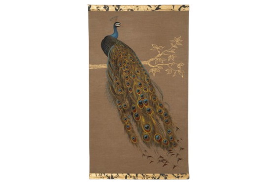 Painted canvas, or decorative panel, depicting a peacock on a branch. Artist's monogram in the lower right corner.