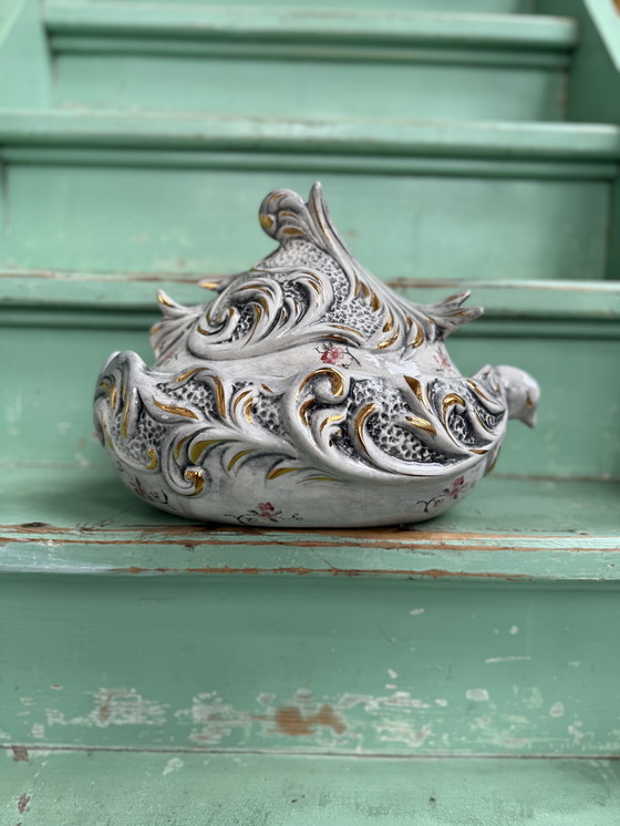 Add a touch of Italian elegance to your home with this beautiful Capodimonte porcelain bowl with lid. Perfect for those who appreciate a touch of flair, this piece is all about refined details and classic Baroque style. Imagine it as a focal point on your dining table or a charming addition to your display cabinet.