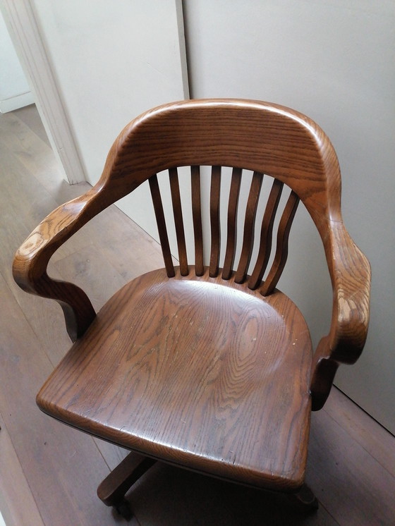 Discover the charm of this vintage Captain's chair, perfect for your home office or reading nook. With its warm brown wood and classic design, this chair adds a touch of nostalgia to any space. The tilt mechanism provides extra comfort and flexibility, ideal for long workdays or relaxing moments.