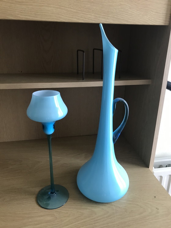 A decanter with its stemmed glass in opaline glass from the 1960s Decanter: 47 x 16 cm Glass: 31 x 10 cm
