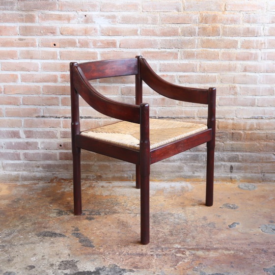 This wooden chair by Italian designer Vico Magistretti (born 1920) dates from 1959. It was originally designed for the restaurant of a golf club in Italy called Carimate. It is easily recognizable by the thickened legs. It is upholstered with rushes. The chair was marketed by both Comi and Artemide (in Italy and the UK) and Cassina (in Europe from 1962). To commemorate Vico Magistretti's 100th birthday in 2020, Fritz Hansen released a new version of the chair with minor changes to the backrest, seat height, and upholstery material. This older model has a dark wood finish and is in good vintage condition with some minor signs of wear.