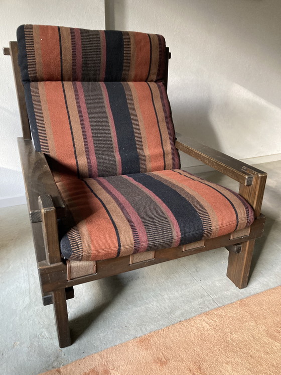 Step back into the elegance of the 1970s with this exquisite Carl Straub lounge set. These four chairs, crafted with precision and style, are a testament to the era's iconic design. The warm hues of brown, orange, and black in the textile upholstery create a striking visual appeal, perfectly complemented by the robust wooden frame.