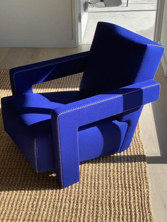 Refined Armchair mod. 637 Utrecht by Cassina, upholstered in a very soft wool cloth in BLUE with a Horsehair stitching by T. G. Rietveld, is an iconic design piece, the result of the design of the great and famous Dutch master Gerrit Thomas Rietveld in 1935-36. This armchair, which belongs to a special collection, IS NEW and has never been used. The soft woollen cloth upholstery in a beautiful BLUE shade not only provides a refined aesthetic, but also offers a pleasant warm tactile sensation. The steel frame is carefully padded with polyurethane foam and polyester wadding. The contrasting stitching, precisely executed in horse stitch, emphasises the angular cubist lines, while the comfortable seating posture makes it ideal for relaxing moments. A timeless work celebrating its 90th anniversary this year, a symbol of 20th century design and perfect for those seeking a piece of history with a touch of exclusivity. Modern De Stijl (Neoplasticism). DIMENSIONS W. 64 cm D. 89 cm H. 70 cm W. 37-39 cm. PRODUCT CONDITION NEW- NEVER USED