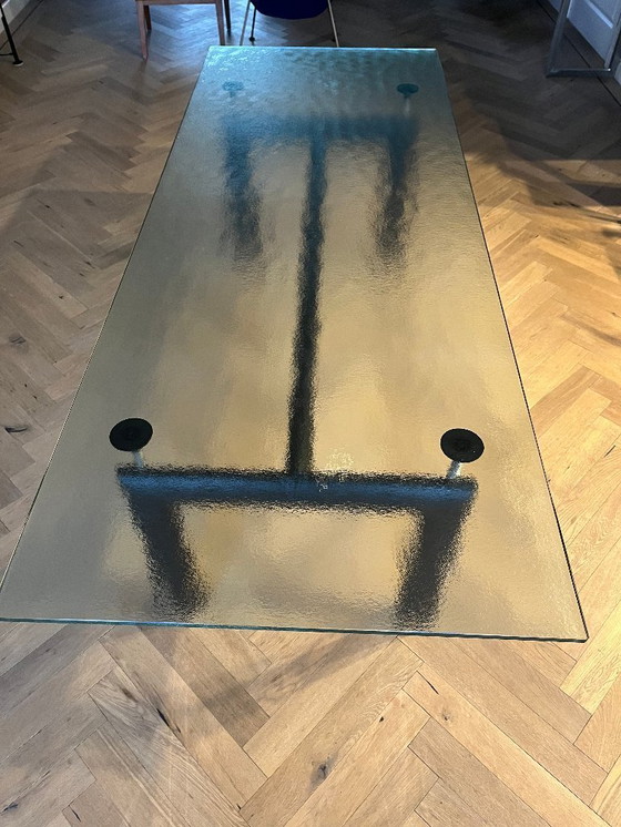 Beautiful Cassina Le Corbusier LC6 dining table. This iconic table, designed by Le Corbusier, Pierre Jeanneret, and Charlotte Perriand, is a timeless piece of furniture that fits perfectly in both modern and classic interiors. The base is made of metal and the top of glass. The table comfortably seats 4-6 people and is ideal for dinners or as a statement piece in your dining room or office. The table has 2 minor damages, see photos.