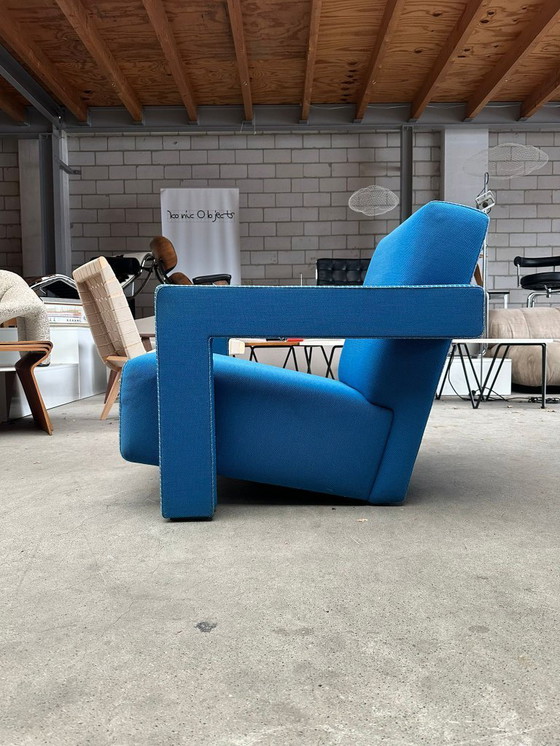 The Cassina Utrecht armchair, designed by the iconic Gerrit Rietveld, is a masterpiece of modern design. With its clean lines and geometric shapes, this chair pays tribute to the simplicity and functionality that defines Rietveld's work. Upholstered in a rich blue textile, this armchair offers not only visual appeal but also exceptional comfort. The striking stitching adds a subtle detail that enhances the chair's aesthetic. Perfect for both modern and classic interiors, this armchair is a versatile addition to any space. Experience the timeless elegance of the Utrecht armchair and add a piece of design history to your interior. Each chair is sold individually. Several are available. All show signs of wear, such as slight wear/discoloration on the armrests and occasional loose white stitching (which can be restored with a little love and patience).