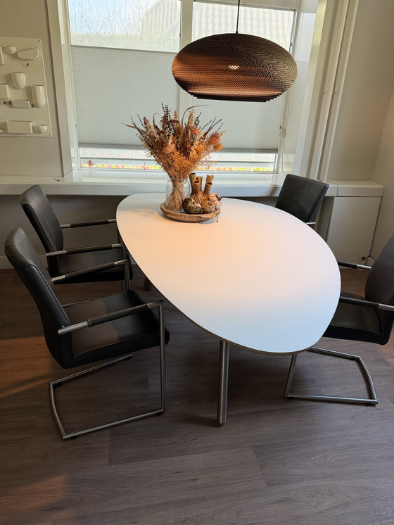 Castelijn Circlips 2 table in like-new condition, including 4 leather sled-leg chairs.