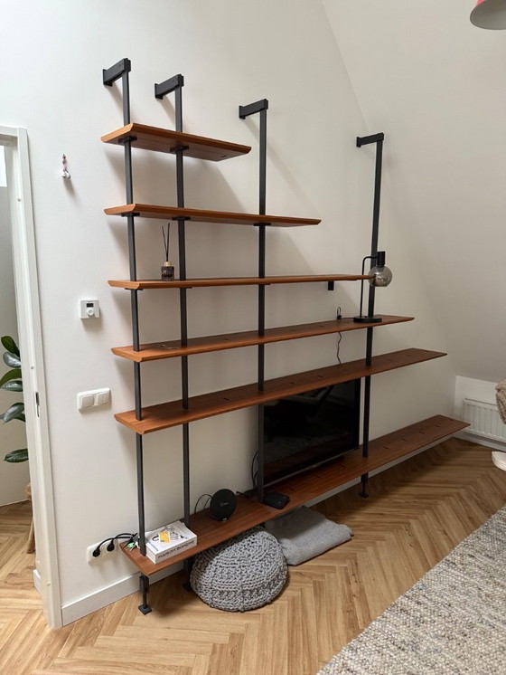 Timeless items by designer Giorgio Cattelan. Bookcase can be wall mounted or cornered. Uprights Brushes gray finish. Shelves warm walnut.