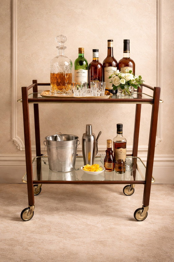 This serving trolley is a rare design from the first series. The trekkey features a teak wood frame with glass shelves.