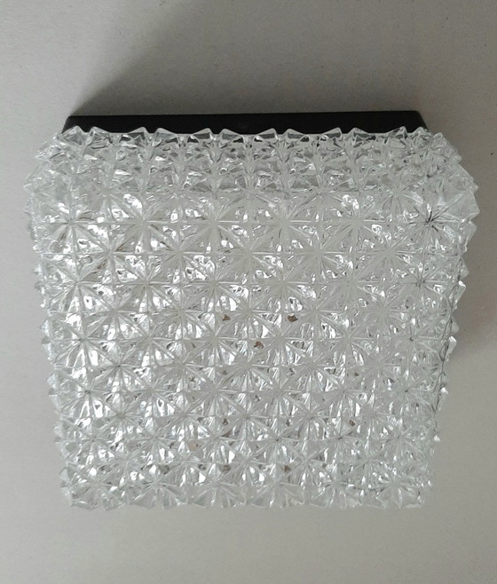 This large vintage ceiling light by Erco Leuchten Germany from the 1960s is an eye-catcher. The unique pattern of the glass provides brilliant light distribution, while the Bakelite base offers an authentic retro look. Ideal for lovers of vintage design, this lamp adds a touch of nostalgia and style to any room.