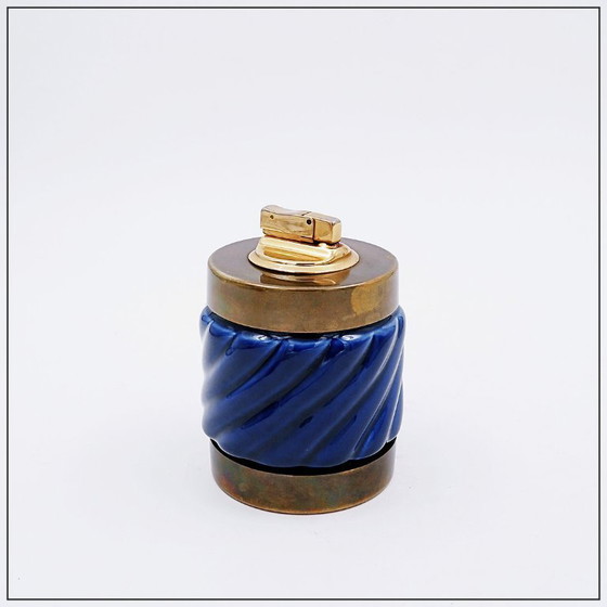 Vintage Tommaso Barbi table lighter in royal blue ceramic and brass.