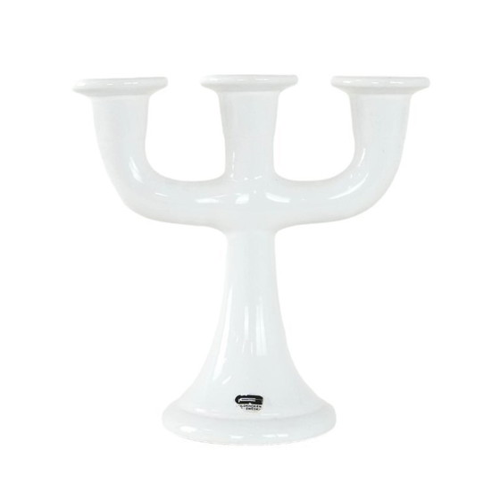 Vintage white ceramic candlestick by Guldkroken Hjo, Sweden, dated to the second half of the 20th century. The three-armed form with streamlined lines represents the minimalism and elegance characteristic of Scandinavian design. An excellent decorative element that combines functionality with timeless aesthetics.