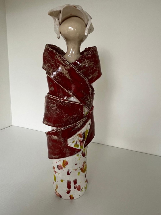 Colorful glazed sculpture of a woman with a hat and shawl. Mexican handiwork.