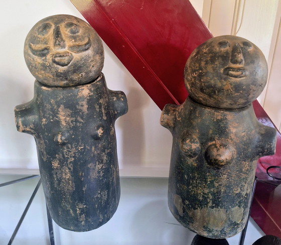 Discover the unique charm of these mid-century Italian ceramic statues, which bring a touch of tribal art to your interior. With their expressive faces and robust forms, these sculptures pay tribute to traditional crafts and add an artistic dimension to any space.
