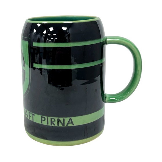 This original ceramic mug was made by the Hedwig Bollhagen (HB) factory, one of the most important and respected artistic ceramics factories in post-war Germany. The piece dates from the GDR period and is distinguished by its striking, contrasting black and green decoration and the simple, graphic aesthetic typical of HB, inspired by modernism and Bauhaus.