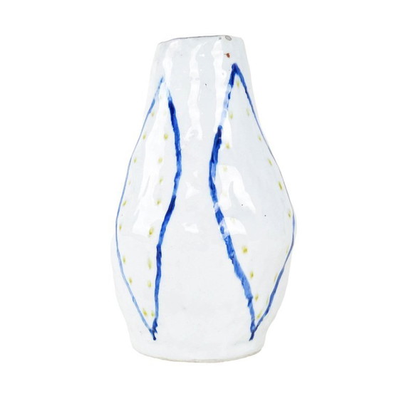 A ceramic vase with an irregular, hand-formed shape, covered with white glaze and painted decoration. The surface features geometric motifs in the form of blue contours with yellow dots, giving it a lightness and unique character.