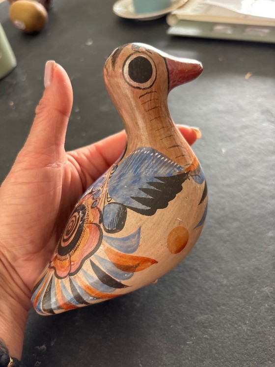 Discover the charm of Mexican craftsmanship with this beautiful ceramic figurine. Hand-painted in vibrant shades of brown, blue, and orange, this piece brings a touch of color and culture to any room.