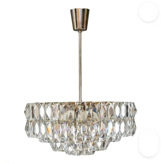 The specific characteristics — the use of heavy, faceted crystal prisms mounted on a chrome-plated or nickel-plated metal frame — are typical of important designers such as