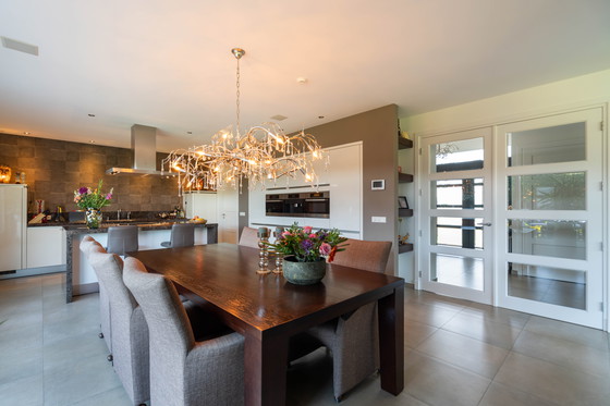 This chandelier is inlaid with silver leaf and decorated with many glass droplets. The design resembles branches. The lamp features 16 dimmable E14 candle-shaped 2000K bulbs and 3 individually switchable spotlights.