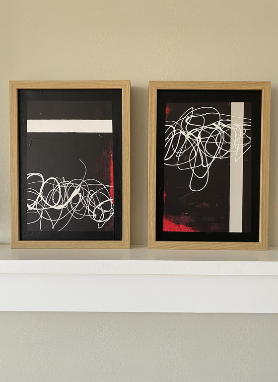 I hereby offer two abstract paintings measuring 21 x 30 cm (A4), titled “Chaos Called Life”. The paintings belong together as a diptych. They come with frames, including a hanging system on the back. They can also be displayed standing (see photo of the back). Of course, the paintings can also be hung separately.