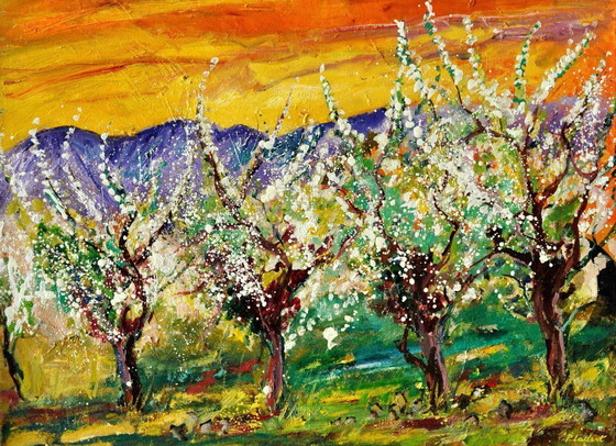 Discover "Cherry Blossoms," a captivating artwork that captures the fleeting beauty of spring. This impressionistic painting, rich in vibrant colors, evokes a scene of cherry trees in full bloom, bathed in golden light and under a blazing sky.