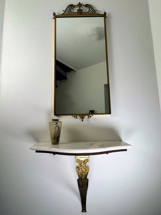 This Set Is An Absolute Eye-catcher And Exudes Elegance And Craftsmanship. The Mirror Features A Decorative Rococo-style Brass Top, With Refined Curls, Flower Accents And A Central Shield Motif. The Wall Console Has A Solid Marble Top With Soft Curves On The Front And Is Supported By A Beautifully Crafted Brass Support With Floral Ornaments.